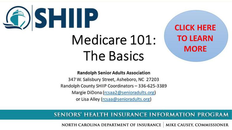 Randolph Senior Adults Association has Seniors’ Health Insurance Information Program (SHIIP) Counselors from The NC Department of Insurance to assist you! Let an unbiased source help you figure out which of the Medicare Advantage or Medicare Part D plans available in Randolph County is right for you.